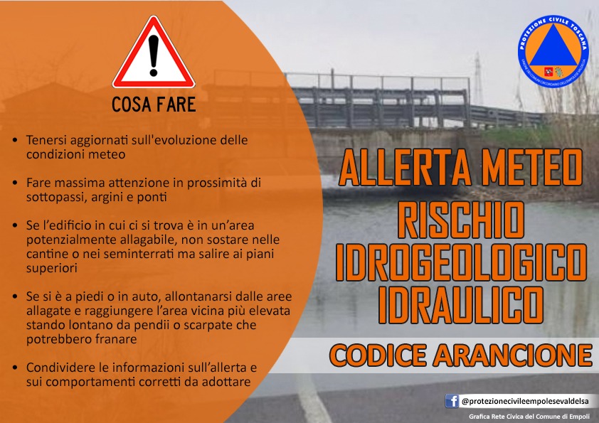 In alcuni Comuni dell'Empolese Valdelsa. Dalla notte fra il 24 e il 25, si aggiunge l'allerta codice giallo oer temporali forti.