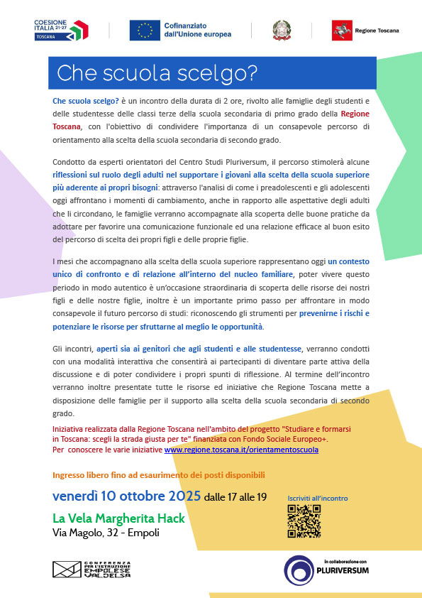 Condividere l'importanza di un consapevole percorso di orientamento alla scelta della scuola superiore. È questo l'obiettivo dell'iniziativa “Che scuola scelgo?”, un incontro di orientamento scolastico rivolto alle famiglie degli studenti e delle studentesse delle classi terze della scuola secondaria di primo grado della Regione Toscana.