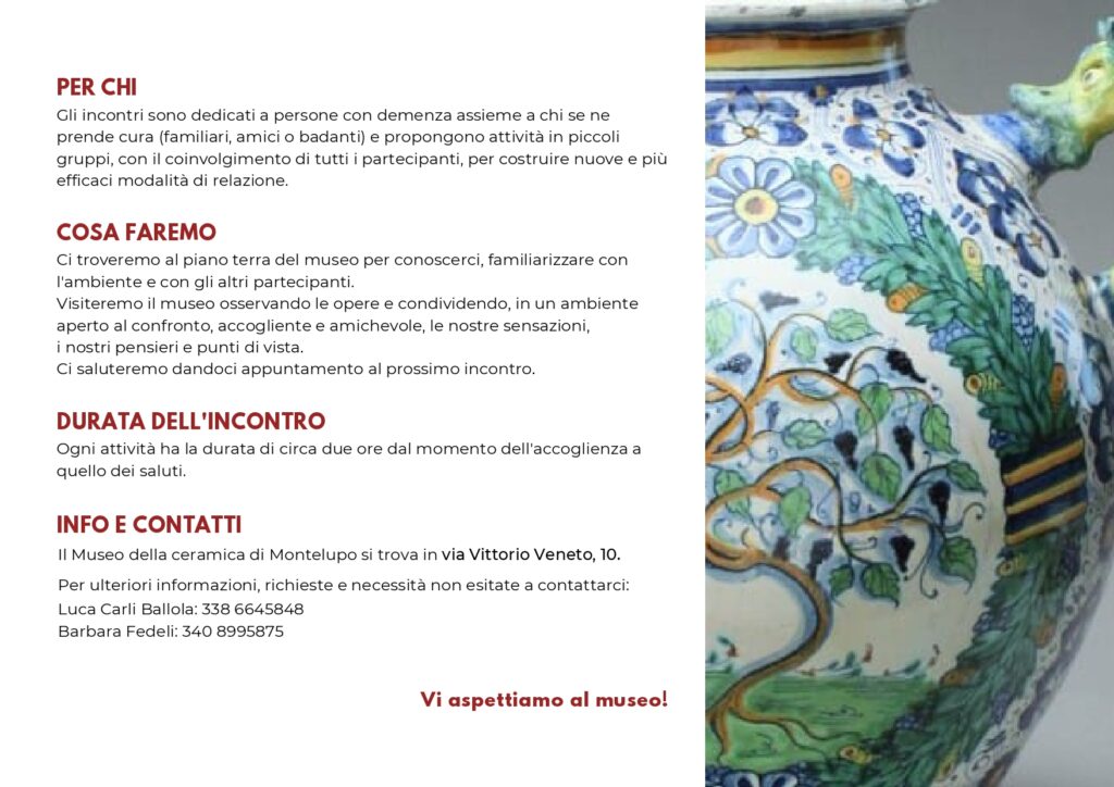 Il gruppo è ora pronto a ripartire con la nuova stagione di appuntamenti in museo e sarà il Museo della Ceramica di Montelupo Fiorentino ad inaugurare la ripartenza. I partecipanti - persone con demenza, insieme a familiari, amici, assistenti domiciliari avranno l’occasione di frequentare i luoghi del territorio dedicati all’arte e alla cultura, apprezzandone le opere e condividendo emozioni e riflessioni.